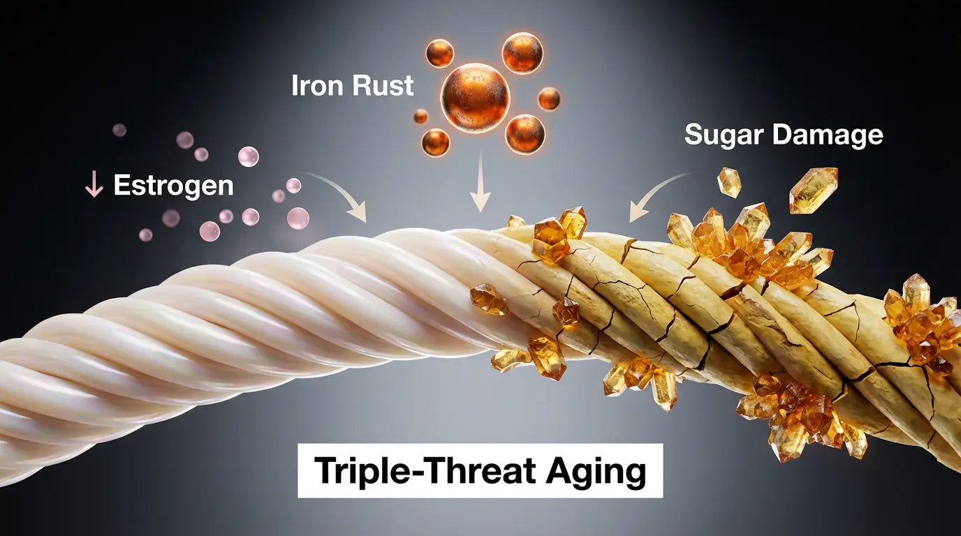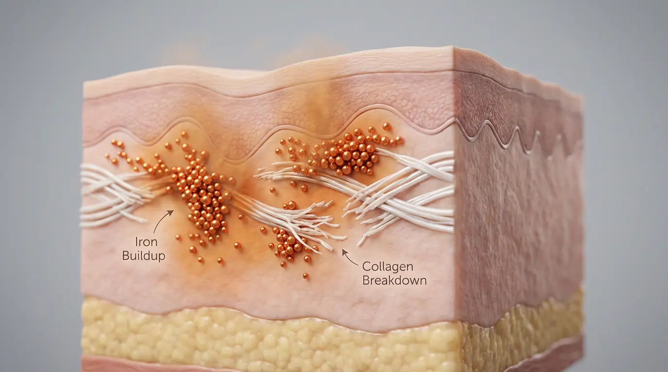 Iron-driven oxidative stress accelerates AGEs (Advanced Glycation End Products)—sugar molecules that bind to collagen and make it stiff and brittle. This is why post-menopausal skin doesn't just sag—it gets crepey. The collagen loses its elasticity entirely.