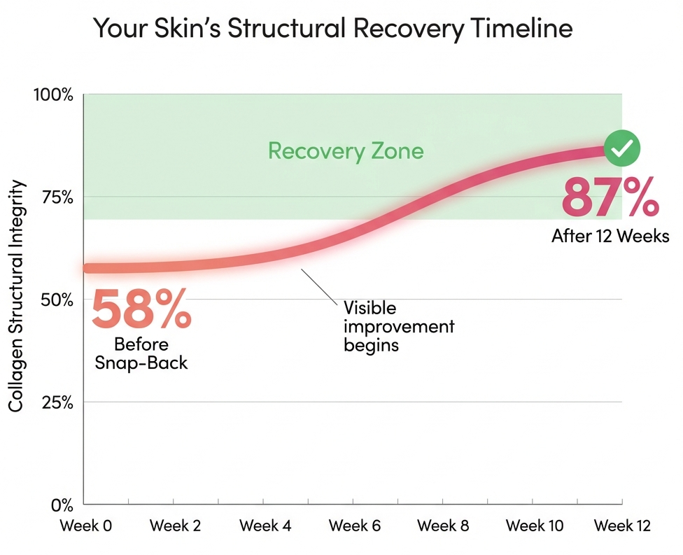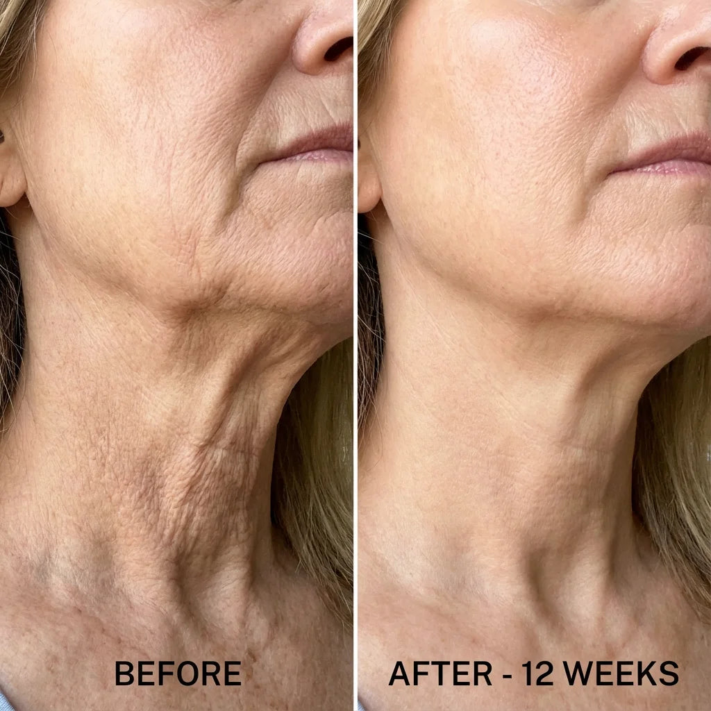 Week 1-2: Better texture. Week 3-4: Increased firmness. Week 6-8: Visible tightening of jawline and neck. Most women see the 'wow' moment around week 8.
